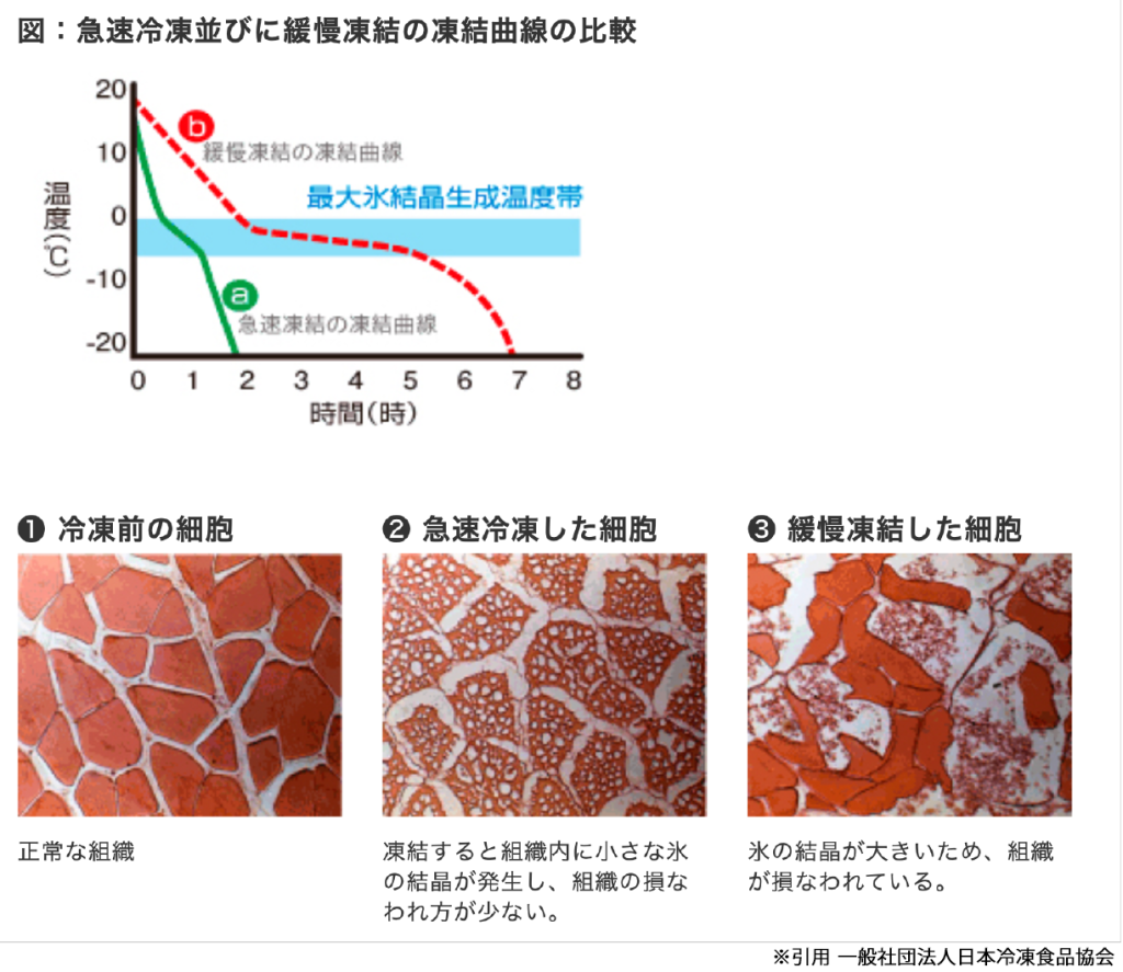 食品の70〜80%を占める水分は、氷結晶になる際に、体積が膨張するため、食品細胞に破壊ドリップが発生してしまうので、旨みも逃げてしまいます。